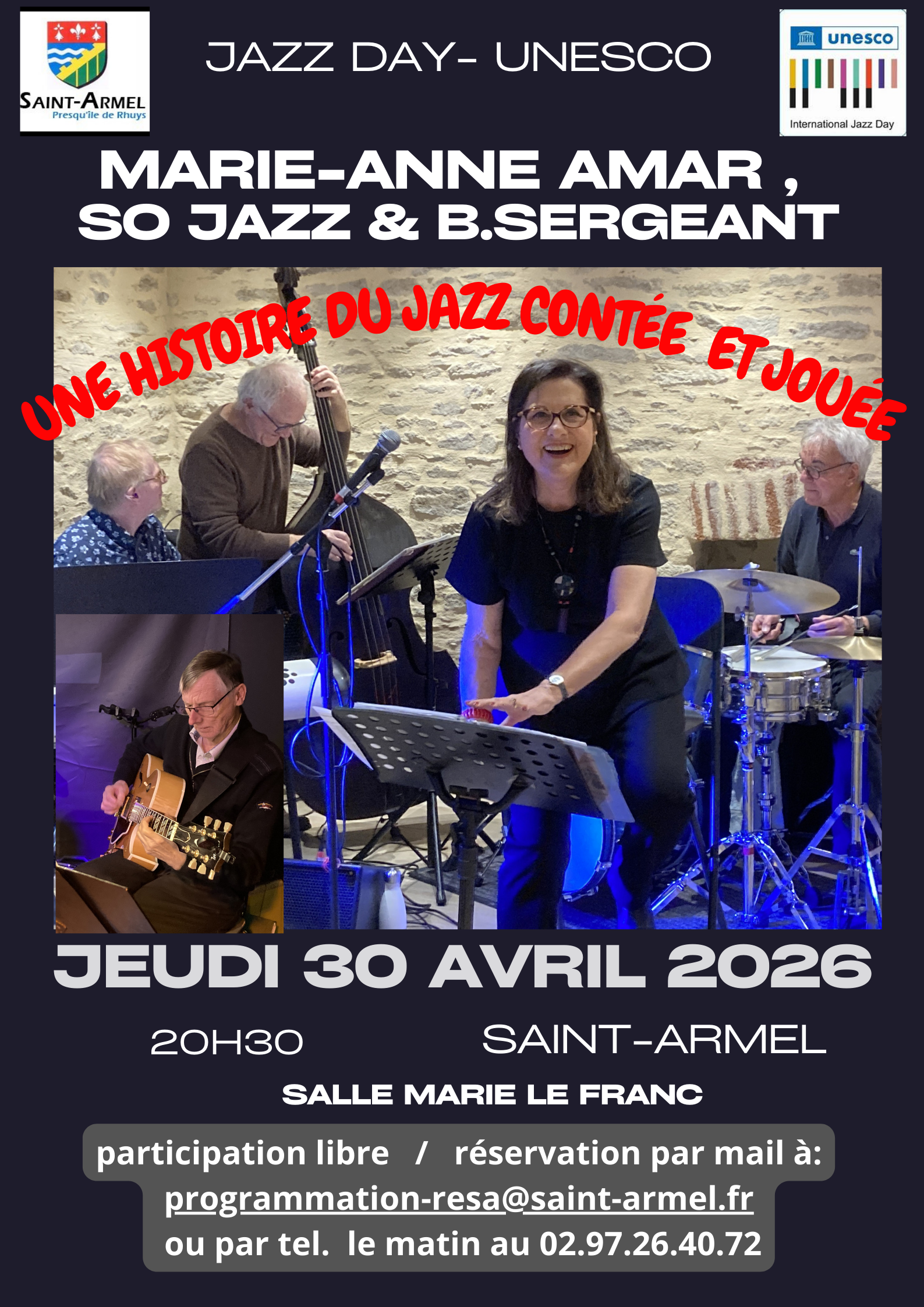 La chanteuse Marie-Anne Amar sera en quintet avec 4 musiciens : Fabrice Harlé au piano, Serge Lannurien à la contrebasse et Gérard Baranzelli à la batterie (le groupe So Jazz) et en invité, Bernard Sergeant à la guitare, Ce concert chanté et « conté » sera l’occasion de présenter l’histoire du jazz, de raconter des anecdotes sur le répertoire et de comparer différents styles d’interprétation.